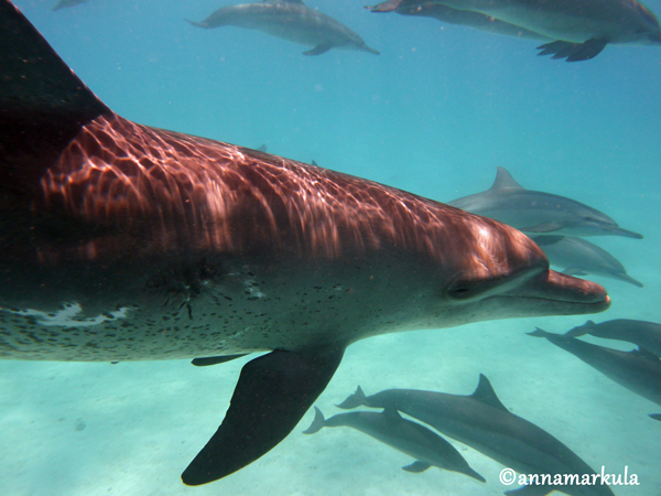 Never having swum with wild dolphins before, I was unsure of how they’d react to some two-legged heavy-breather trying in vain to keep up. Basically the dolphins swam just fast enough to be out of reach, so were either ignoring me or tormenting me with their superior swimming ability.
