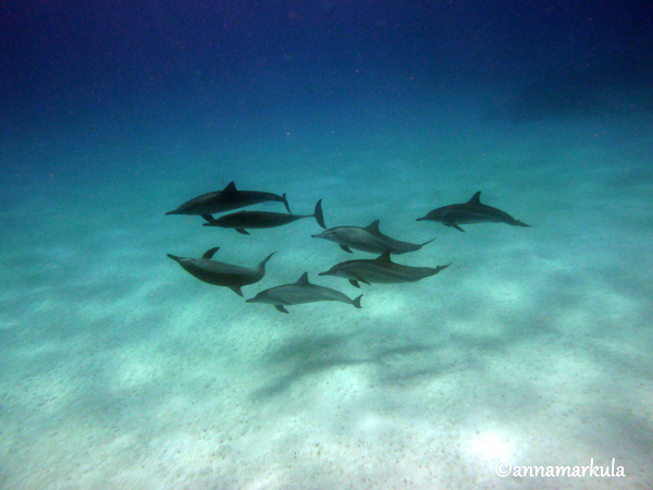 The dolphins we spent most time in the water with were spinner dolphins, small and a bit manic. One day though a calm vibe descended on the group as three bottlenose appeared. It was like seeing a double decker bus next to a mini – they were BIG! And surprisingly cool creatures. I swam around with them for quite awhile and I have to say I did fall in love a little. I swear every time they looked at me they were saying ‘yo dude, hows it going?’. Like I said, super cool.