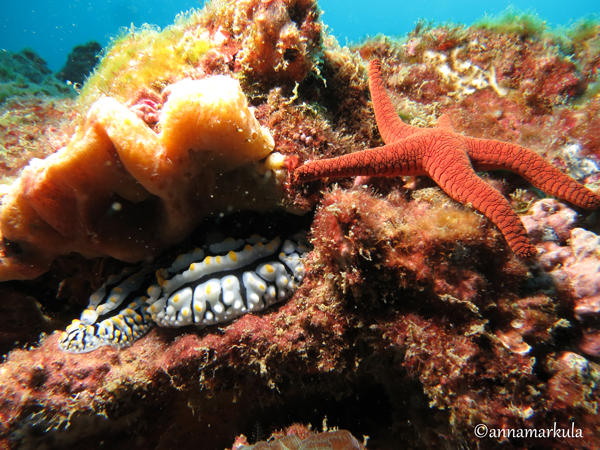 The final days of winter have been somewhat fab here in south-east Queensland, and last weekend was no exception with glassy flat seas and hot hot sun! Which made for perfect dive conditions so I took the opportunity to jump in and try out my new strobe light! After spending a ridiculous amount of time trying to figure out how to assemble and use it (technology is not my strong point!), I was very happy with the results – I am now seeing colours I never saw before! Red is the first colour to disappear underwater, so I got quite a surprise with the Vermillion seastar below when I saw it on my camera – he looked slightly grey during the dive!
