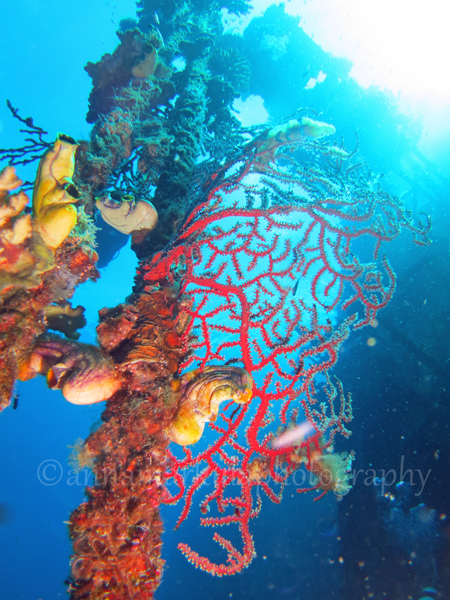 While in the Solomons I was able to dive two wrecks – one an old fishing boat – the Taiyo -which rests vertically against the reef wall, and a WWII wreck of an American P38 aircraft which lies in shallow water just short of the Seghe runway! The P38 was probably one of the best dives I had – fascinating to see a relatively intact aircraft which was covered in the most beautiful pastel-coloured soft corals.